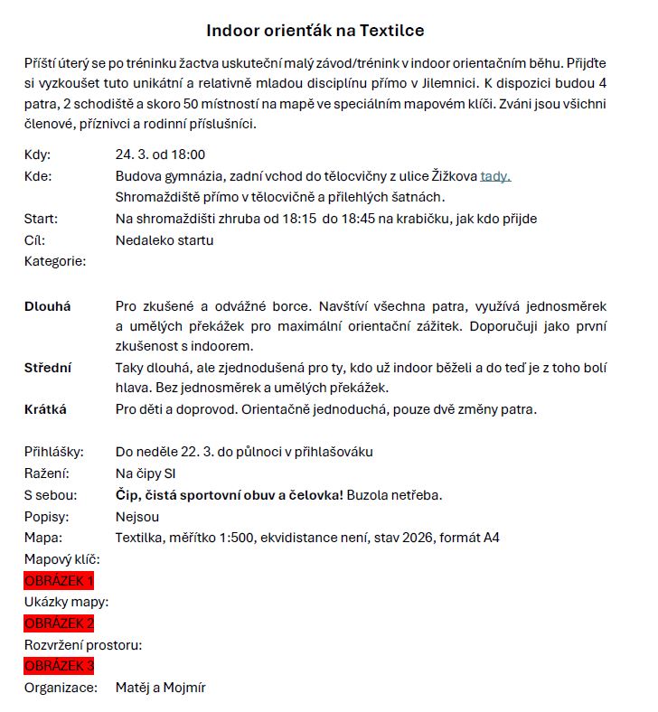 V úterý 24. března 2026 se po tréninku žactva uskuteční malý závod/trénink v indoor orientačním běhu. Přijďte si vyzkoušet tuto unikátní a relativně mladou disciplínu přímo v Jilemnici. K dispozici budou 4 patra, 2 schodiště a skoro 50 místností na mapě ve speciálním mapovém klíči. Zváni jsou všichni členové, příznivci a rodinní příslušníci.