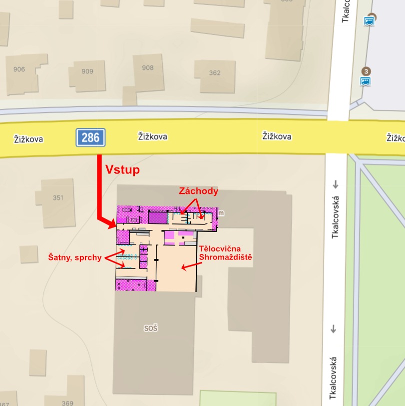 Bude v tělocvičně. Věci si můžete odložit buď přímo tam na lavičkách nebo v přilehlých šatnách, viz plánek shromaždiště.