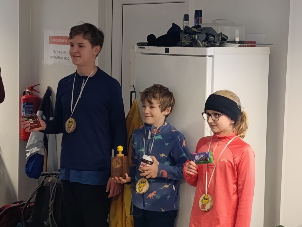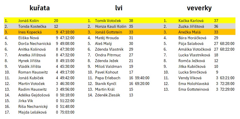 Počasí už bylo zimní. Asi 5 centimetrů sněhu ještě navíc dodaly závodu své neopakovatelné kouzlo. V kategorii Lva zvítězil Tomáš Votoček před Janem Kolínem a Jonášem Gottsteinem. Veverkou se stala po vynikajícím výkonu Kateřina Karlová před Zuzkou Jiřištovou a Anežkou Malou. Kategorii Kuře ovládl Jonáš Kolín před Antonínem Kostečkou a Inés Kopeckou. Sláva vítězům a čest všem ostatním účastníkům. Kromě tradičním putovních cen obdrželi vítězné trojice nádherné medaile, které pro ně vyrobil Šimon Kopecký s maminkou.